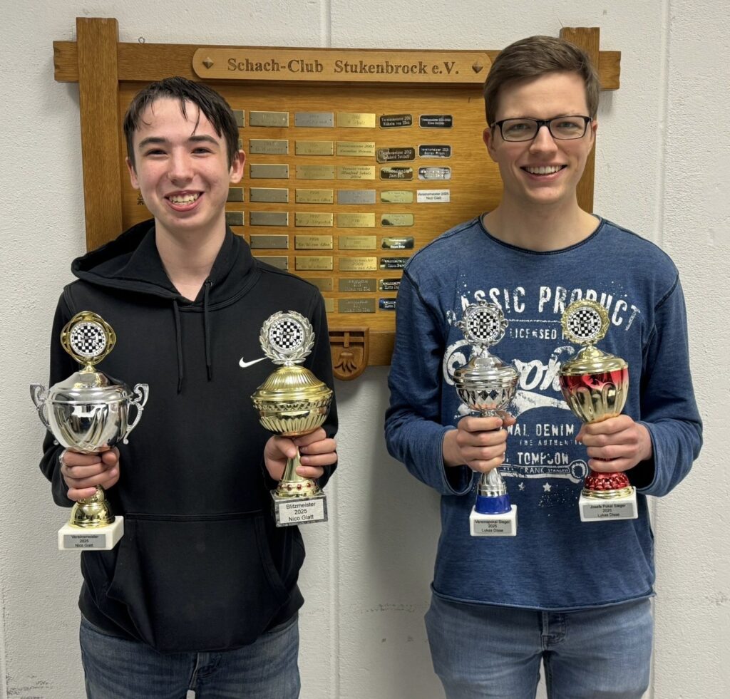 Am 24. März hielt der Schach-Club Stukenbrock seine Jahreshauptversammlung ab. In diesem Jahr stand vor allem die Ausweitung des Jugendtrainings im Vordergrund. So wurde beispielsweise die Aufstellung einer U10-Jugendmannschaft sowie die Durchführung monatlicher Junior-Blitz-Turniere diskutiert. Darüber hinaus wurden die weiteren Aktivitäten des Schach-Clubs für das aktuelle Jahr besprochen. Dabei wurde die erneute Ausrichtung eines Sommerfests beschlossen. Außerdem nimmt der Schach-Club Stukenbrock am 26. April beim Stadtfest teil. Zudem ist erneut ein Simultanturnier mit dem ehemaligen Bundesligaspieler Rigobert Ophoff geplant. Im Hinblick auf die aktuelle Meisterschaftssaison konnte der Vorstand ein positives Fazit ziehen. Der Schach-Club Stukenbrock spielt im vierten Jahr in der Verbandsklasse OWL und hat einen Spieltag vor Saisonende gute Chancen, die Klasse ein weiteres Mal zu halten. Auch bei der Entwicklung der Mitgliederzahlen zeigt sich eine deutlich positive Tendenz. Vor allem Kinder und Jugendliche haben sich dem Verein im Jahr 2025 angeschlossen. Schließlich wurden die Turniersieger des vergangenen Jahres geehrt. Dabei konnte vor allem Nico Glatt auf sich aufmerksam machen. Der 16-jährige Gymnasiast hat sich erstmals in der Vereins- und Blitzmeisterschaft durchgesetzt. Den Vereins- und den Josefspokal sicherte sich wie im Vorjahr Lukas Disse.